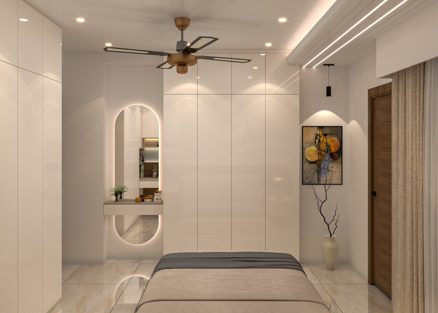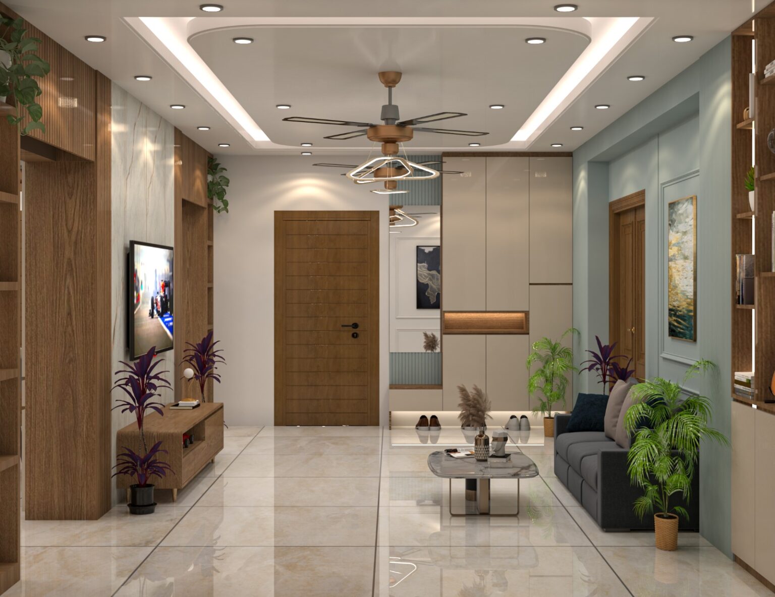 Natural wooden doors and wall panels add warmth and contrast against the neutral wall tones.
